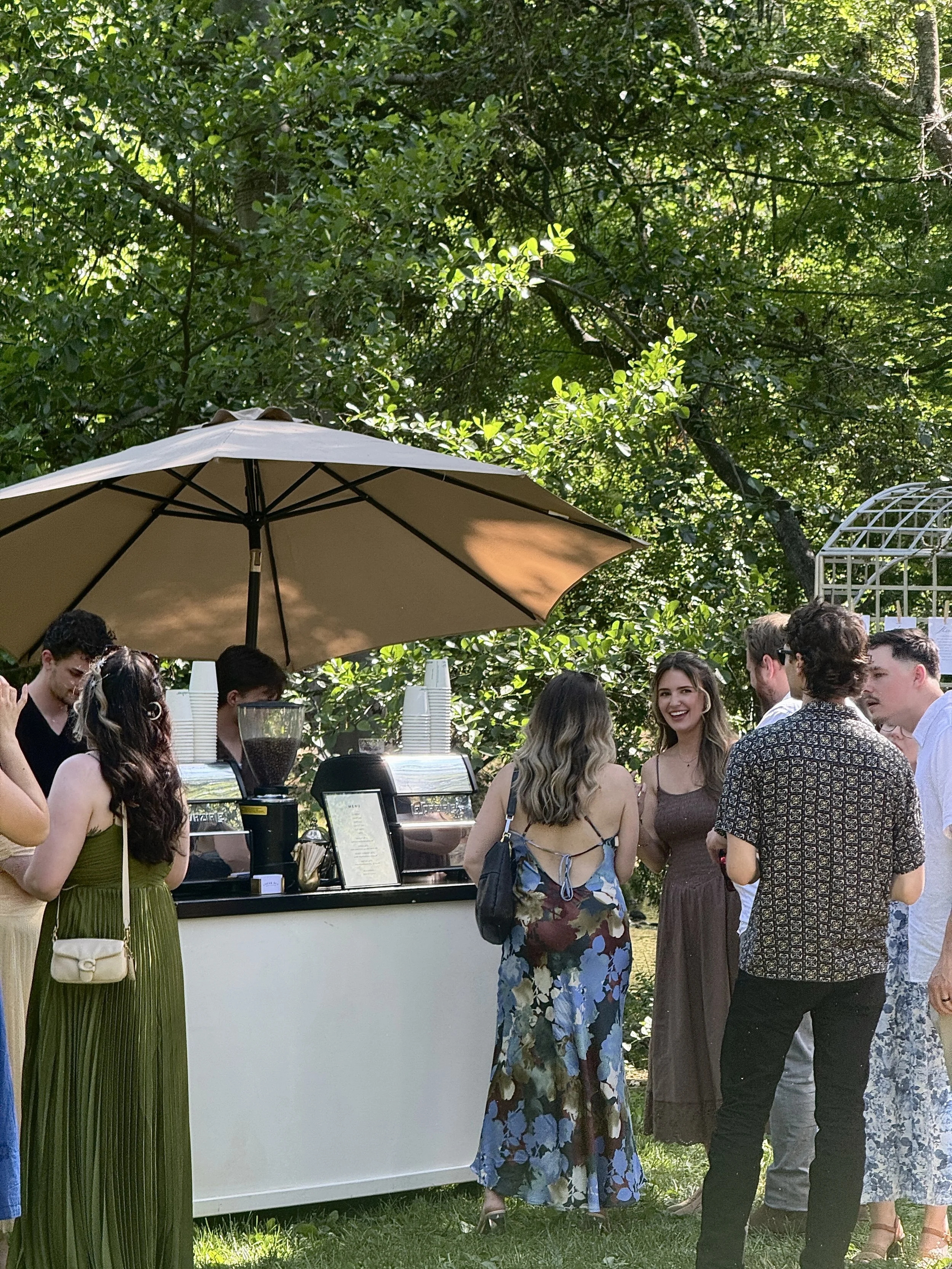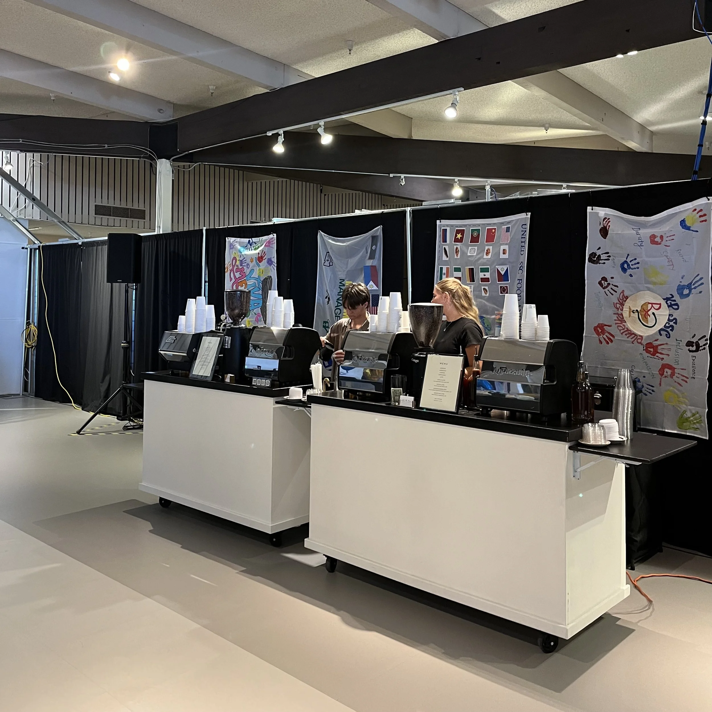Our mobile coffee cart for events is fully equipped and self-contained, so setup is easy on your end. We need about 6 × 6 feet of space and access to power (standard 120v outlets). We provide all the supplies and everything else needed for service.